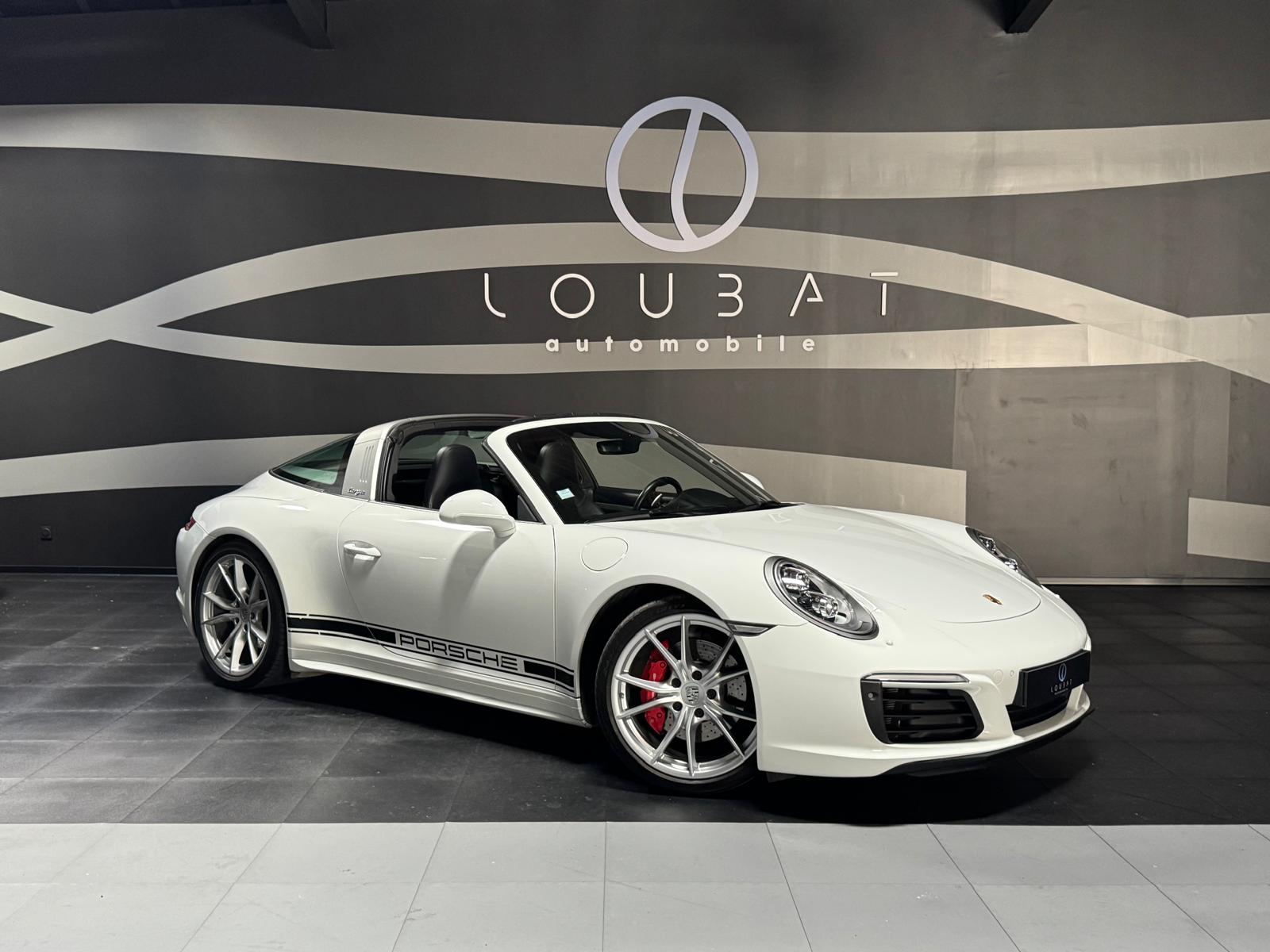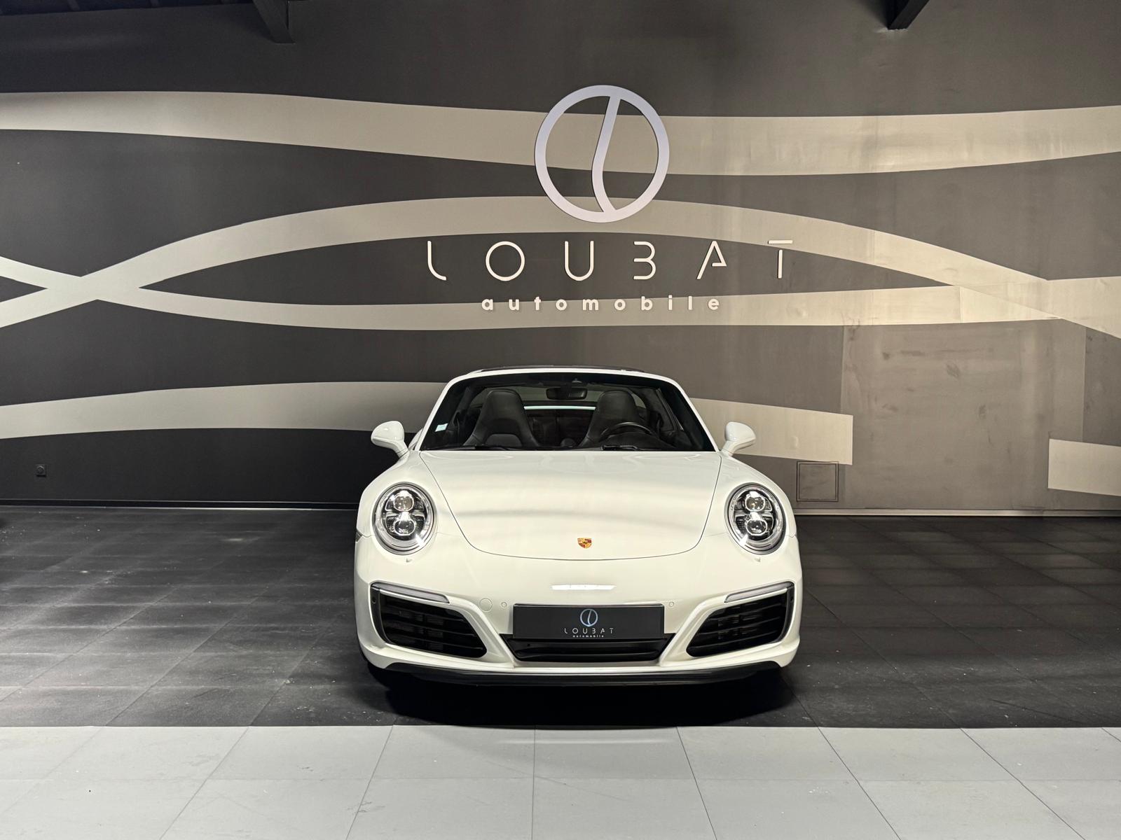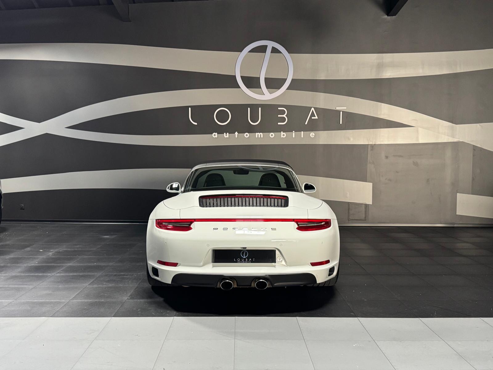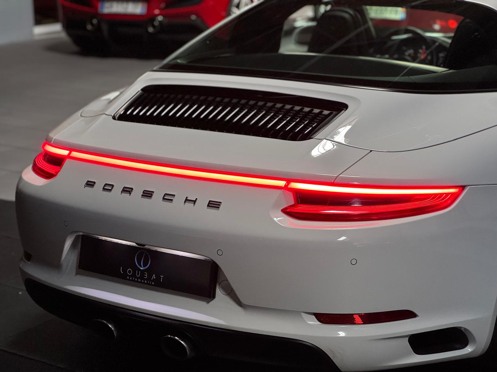 Porsche 911 type 991 phase 2 Targa 4S 3.0 de 420 ch avec boîte PDK 7 rapports et transmission intégrale. Présentée en blanc avec intérieur tout cuir noir et capote noire, elle offre l’expérience unique de la 911 Targa entre coupé et cabriolet. Véhicule français avec historique et entretien exclusif Porsche, configuration riche de 28 824 € d’options, disponible avec garantie 12 mois.