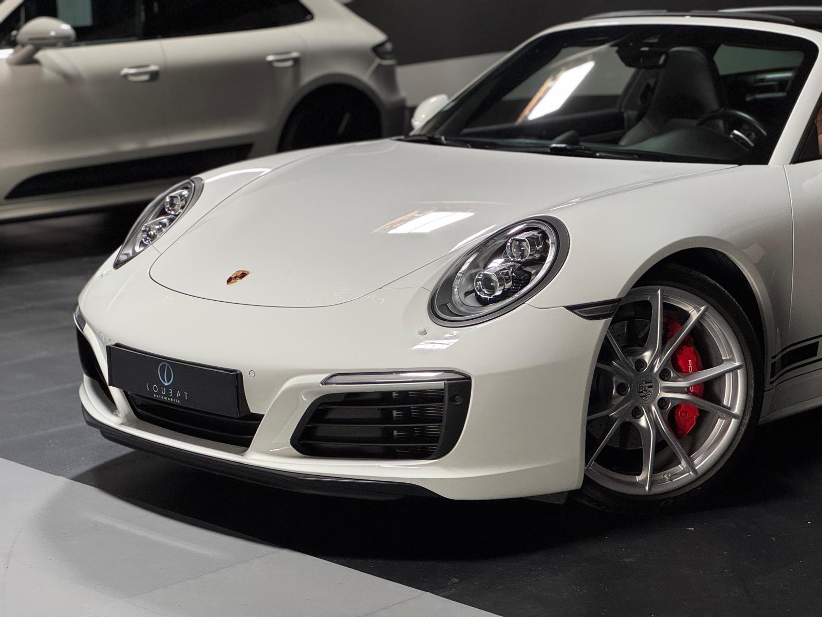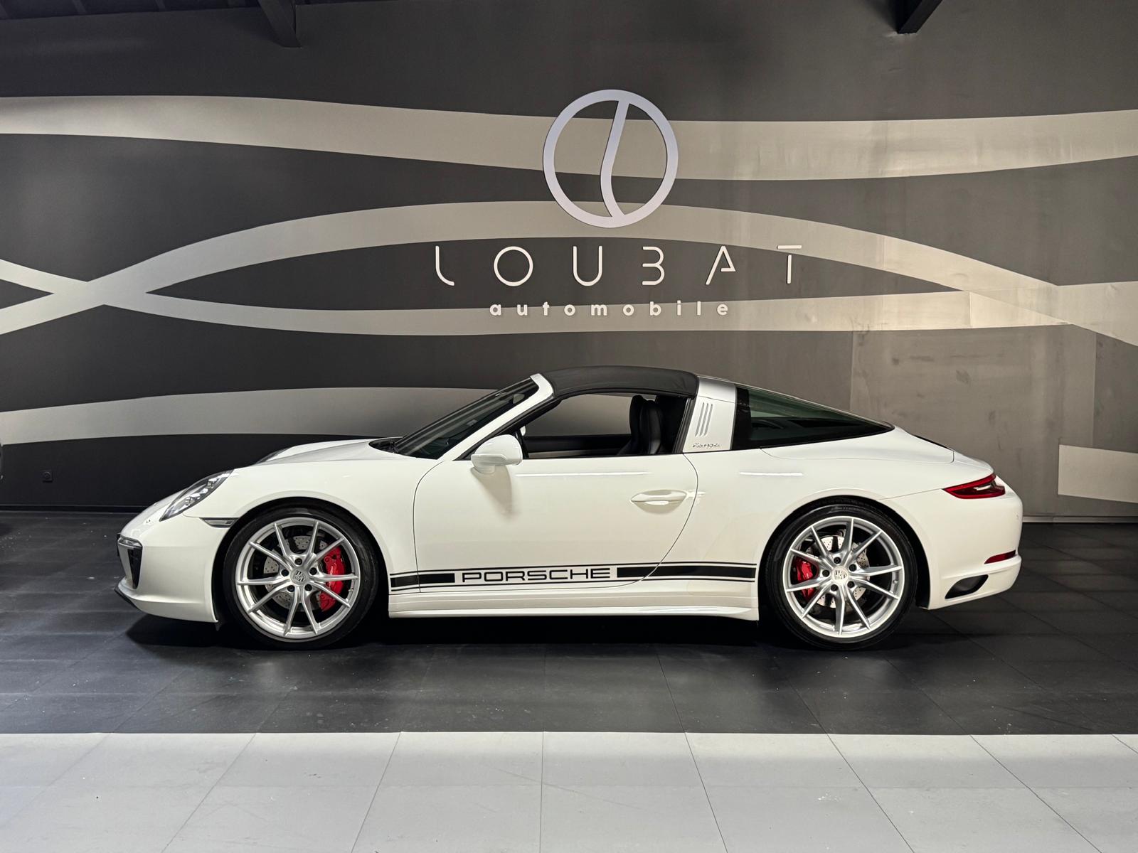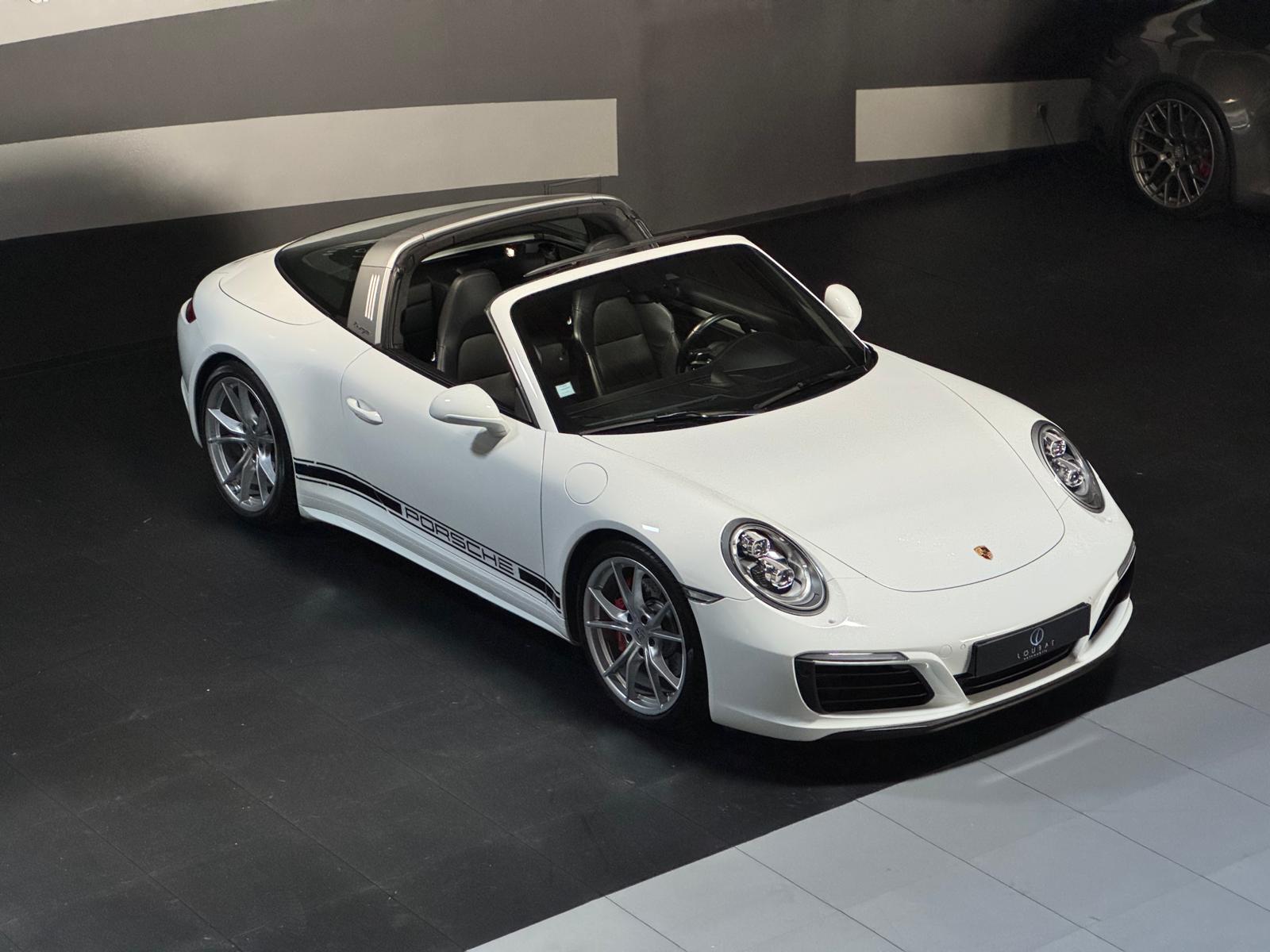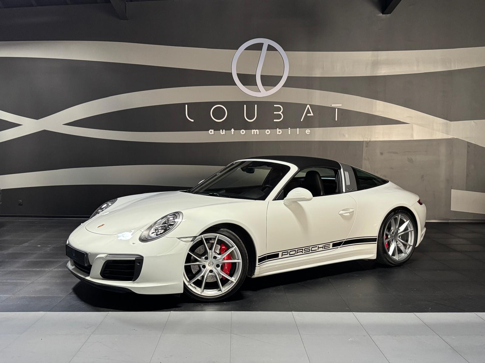 Porsche 911 type 991 phase 2 Targa 4S 3.0 de 420 ch avec boîte PDK 7 rapports et transmission intégrale. Présentée en blanc avec intérieur tout cuir noir et capote noire, elle offre l’expérience unique de la 911 Targa entre coupé et cabriolet. Véhicule français avec historique et entretien exclusif Porsche, configuration riche de 28 824 € d’options, disponible avec garantie 12 mois.