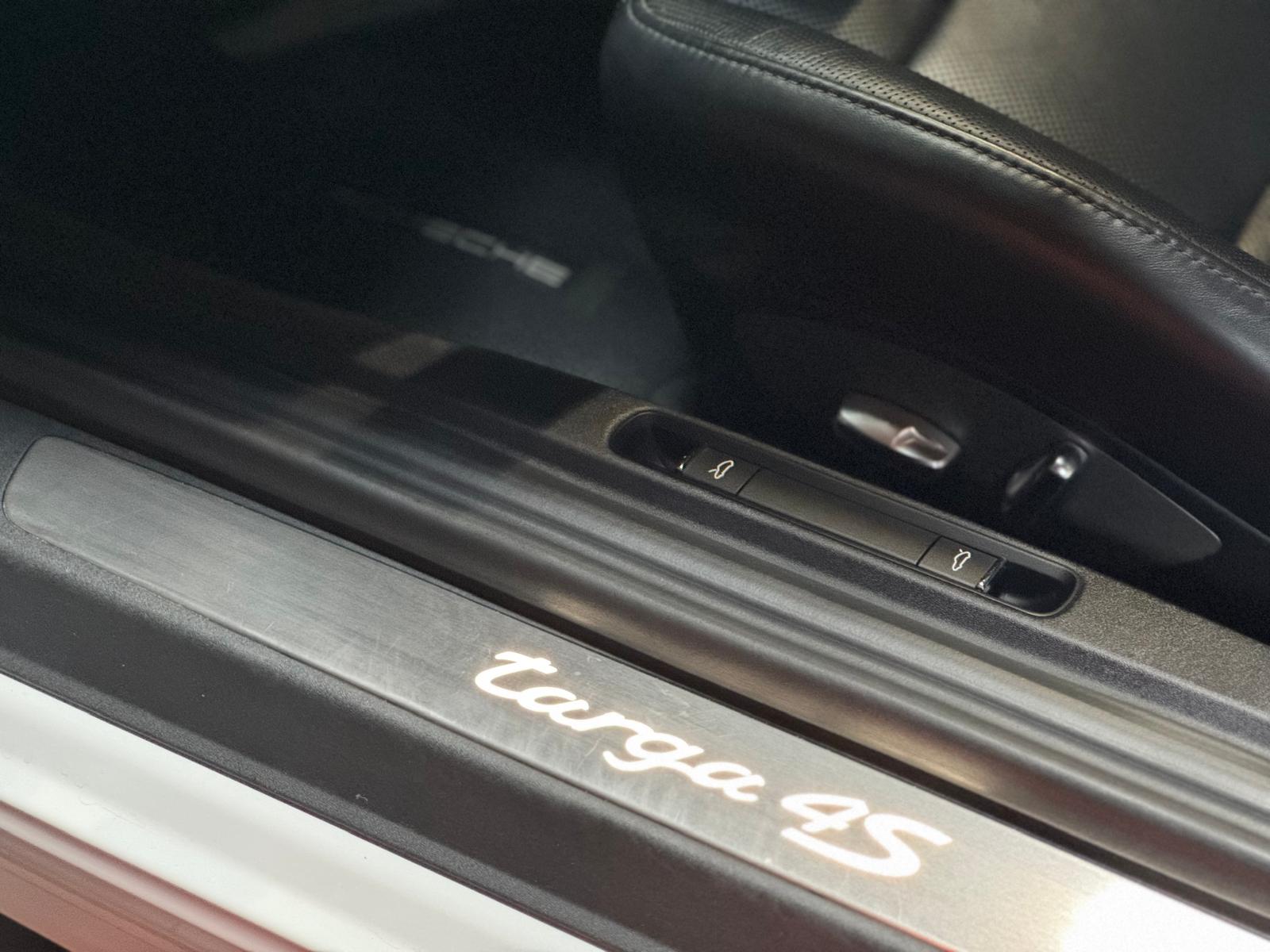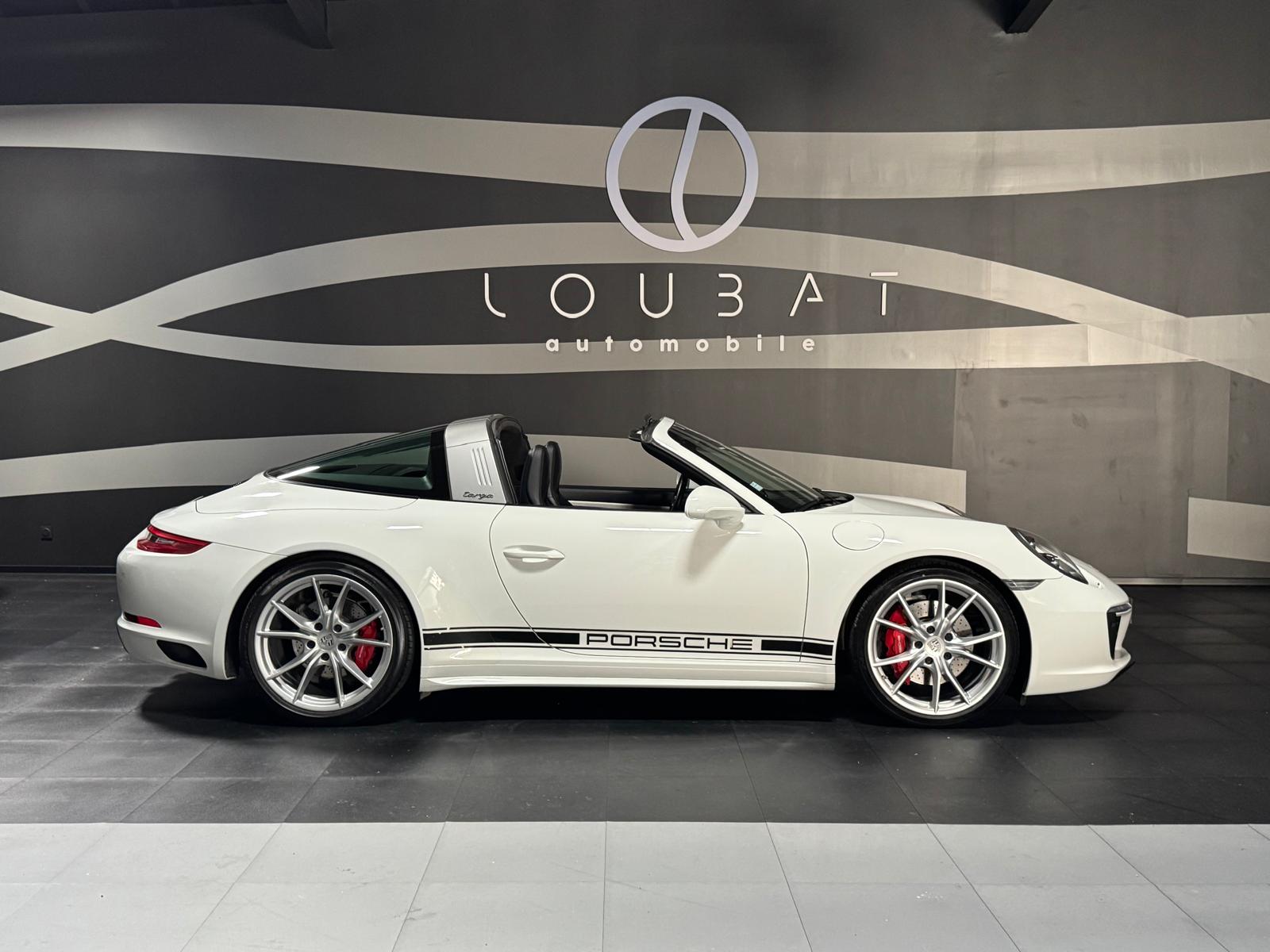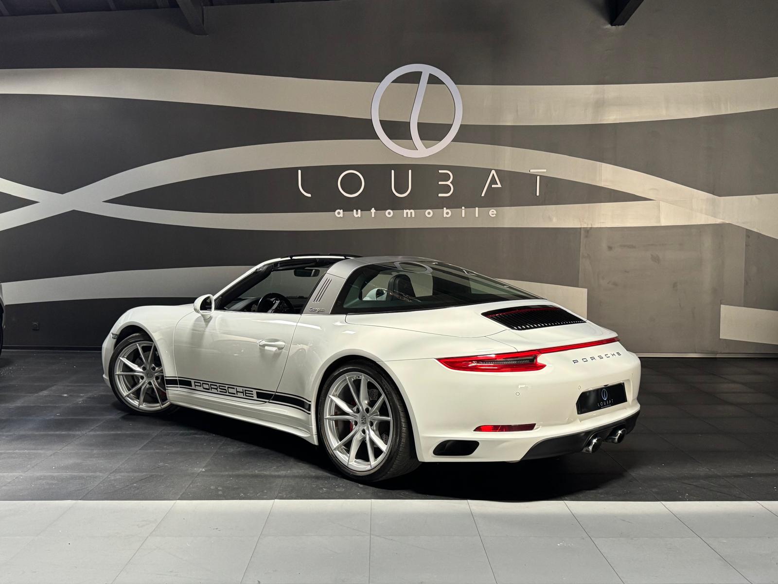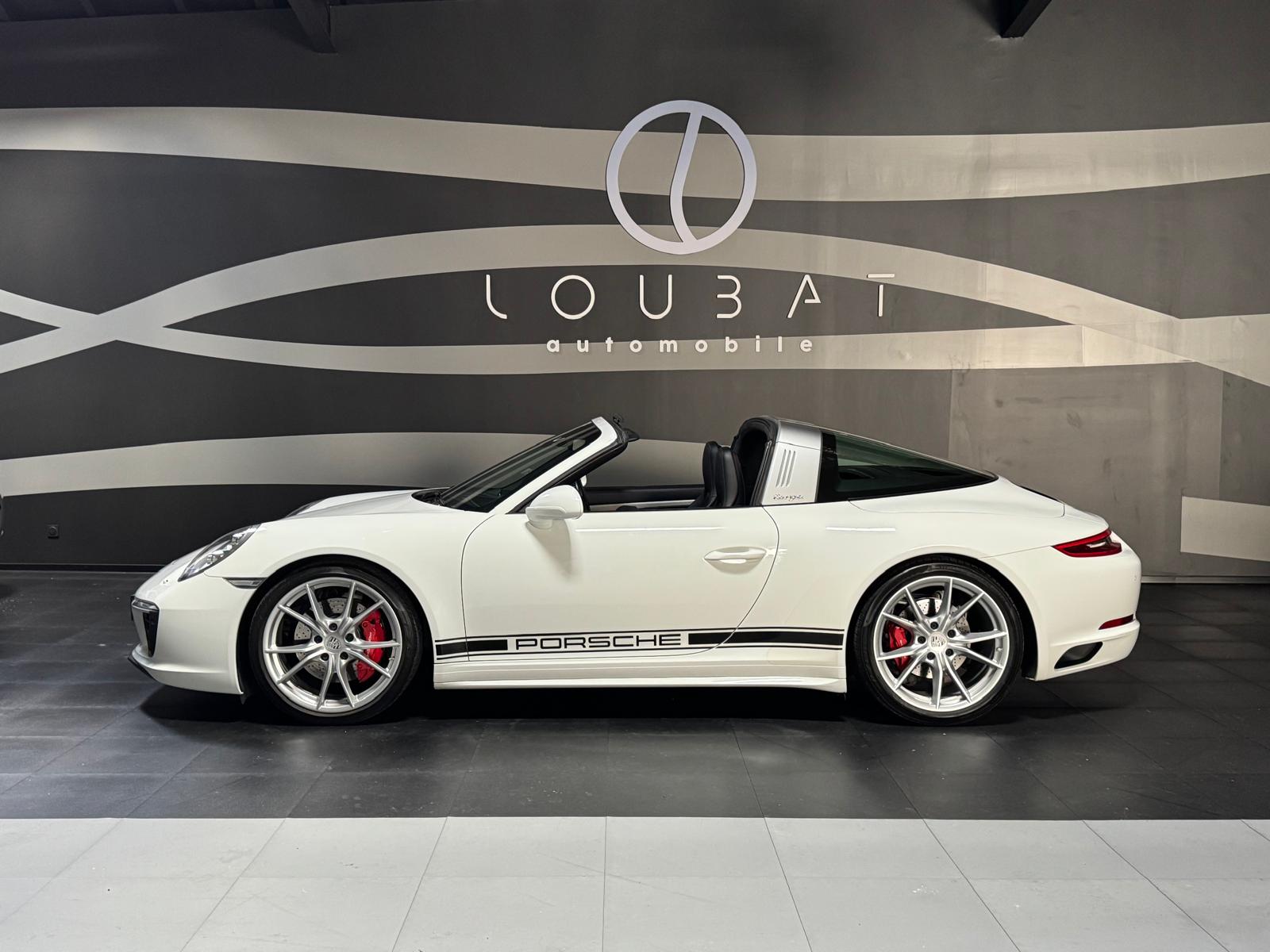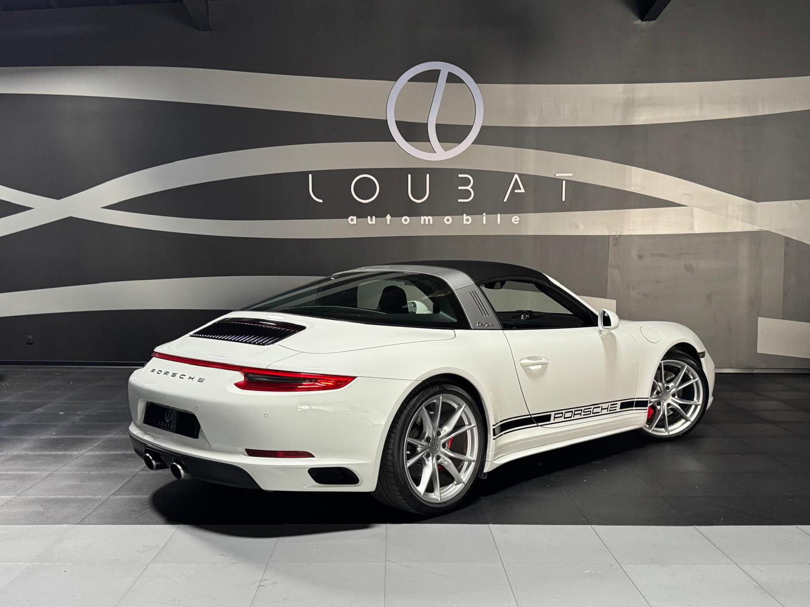 Porsche 911 type 991 phase 2 Targa 4S 3.0 de 420 ch avec boîte PDK 7 rapports et transmission intégrale. Présentée en blanc avec intérieur tout cuir noir et capote noire, elle offre l’expérience unique de la 911 Targa entre coupé et cabriolet. Véhicule français avec historique et entretien exclusif Porsche, configuration riche de 28 824 € d’options, disponible avec garantie 12 mois.