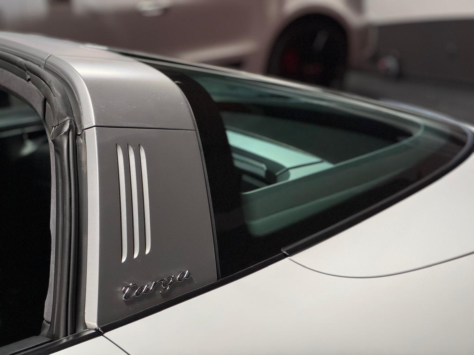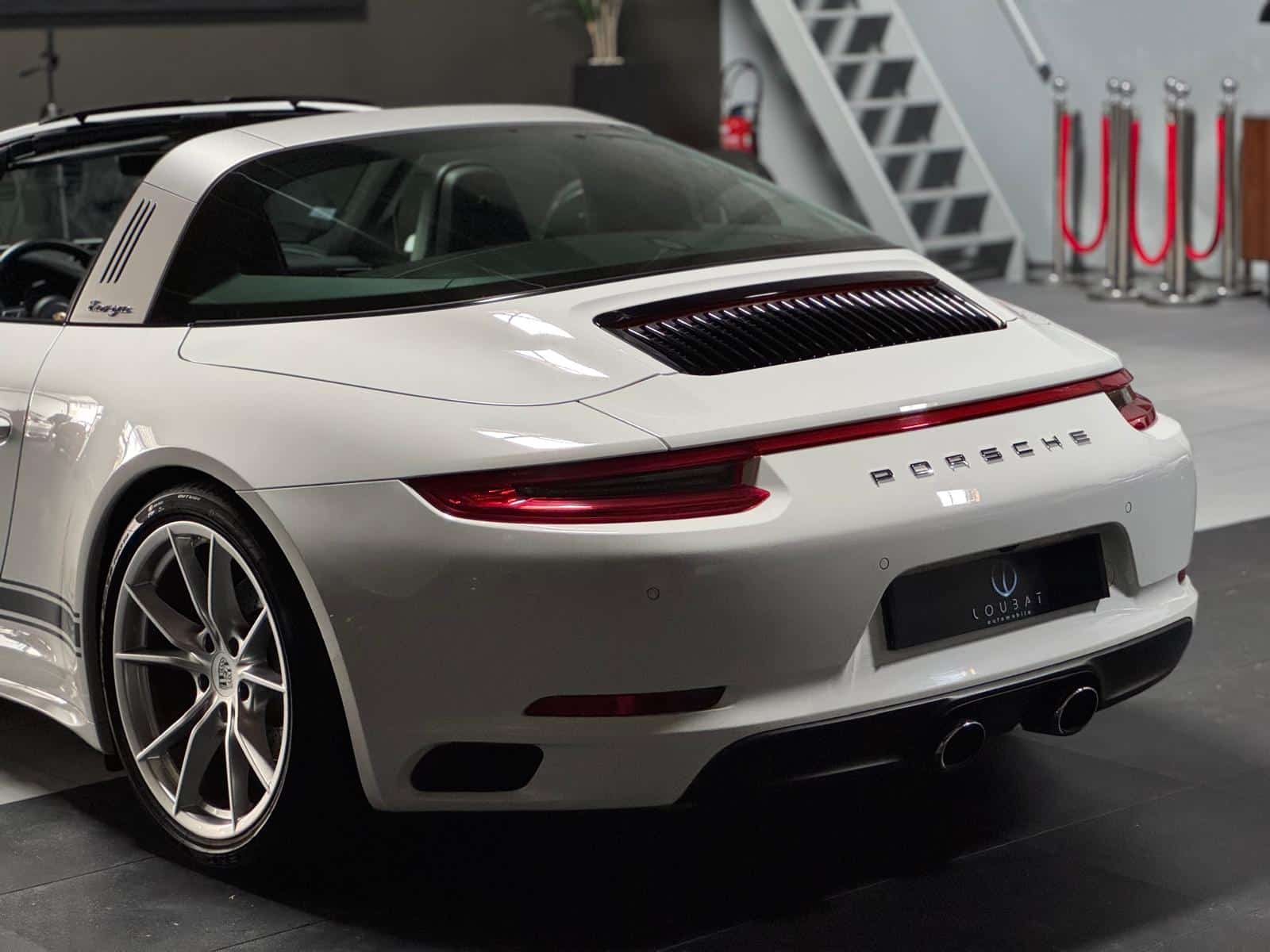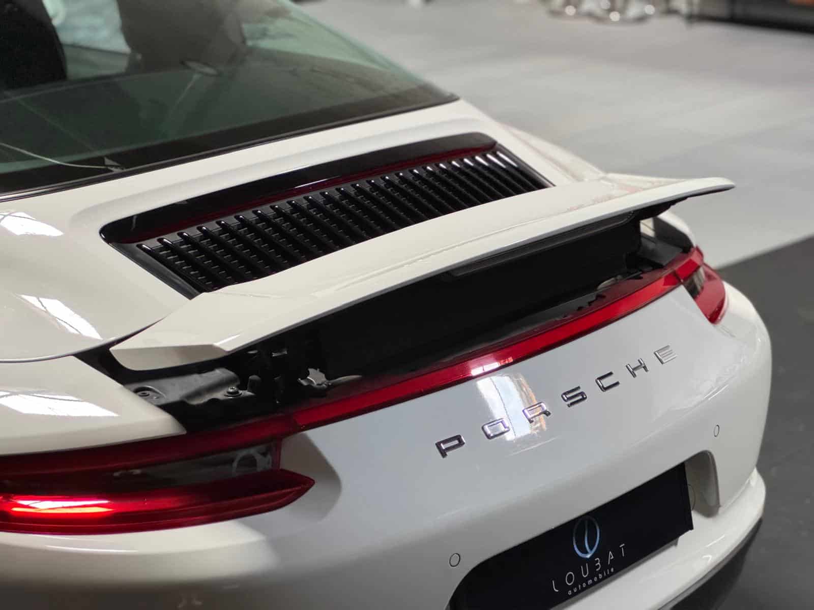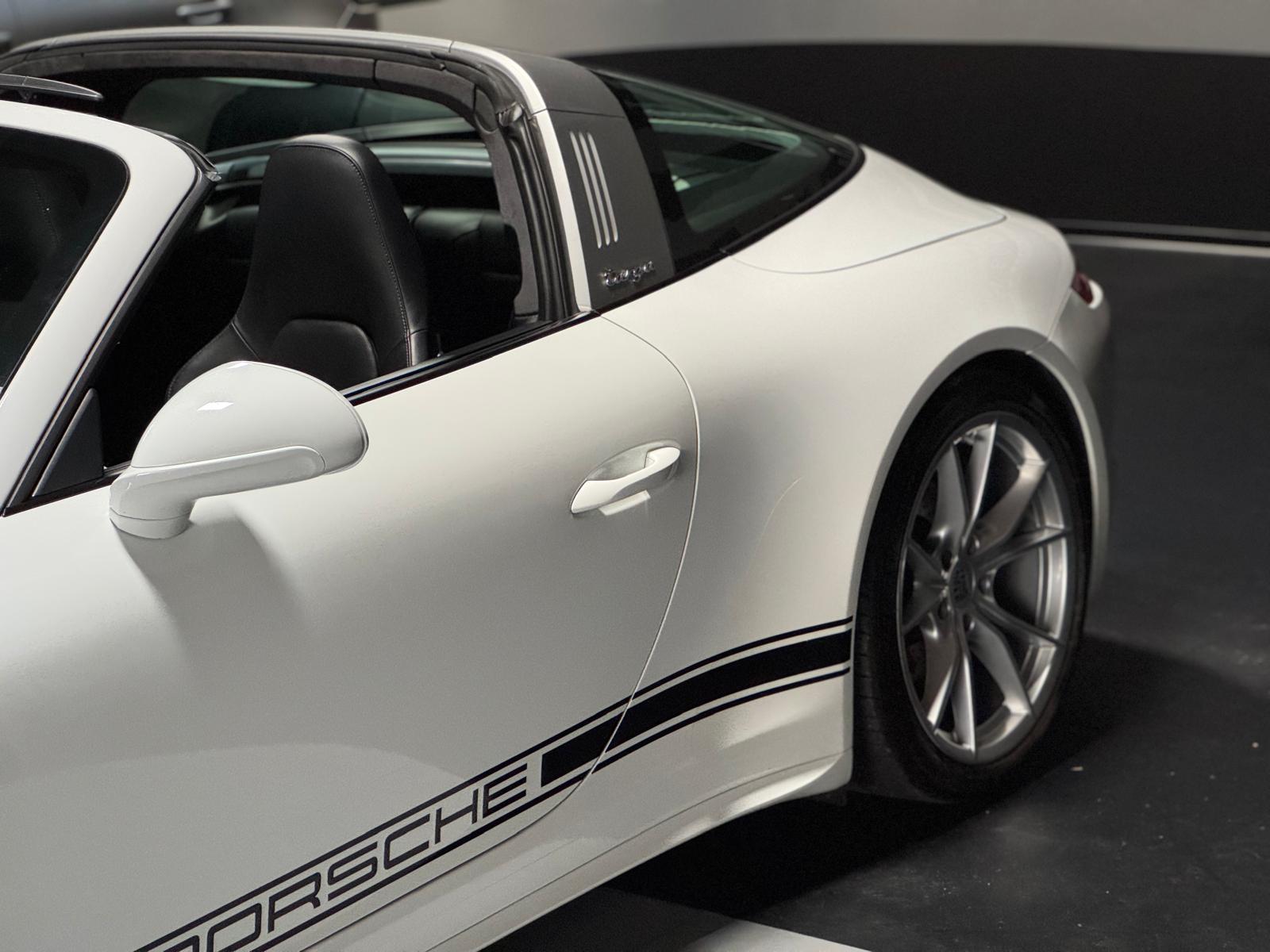 Porsche 911 type 991 phase 2 Targa 4S 3.0 de 420 ch avec boîte PDK 7 rapports et transmission intégrale. Présentée en blanc avec intérieur tout cuir noir et capote noire, elle offre l’expérience unique de la 911 Targa entre coupé et cabriolet. Véhicule français avec historique et entretien exclusif Porsche, configuration riche de 28 824 € d’options, disponible avec garantie 12 mois.